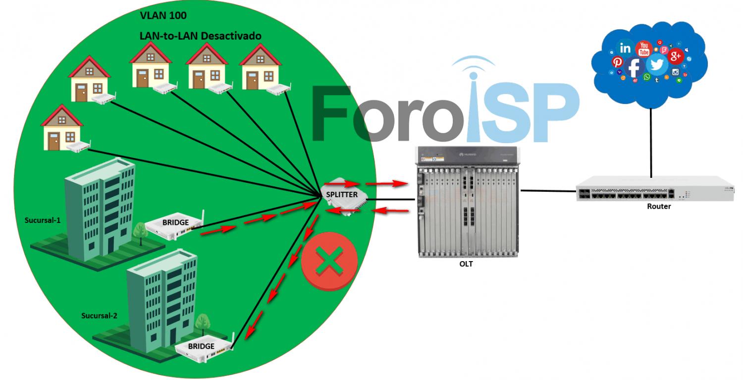 Si manejas una red GPON, lo más probable es que a cada sucursal le dejes una Onu, probablemente la autorices en bridge y hayas creado una VLAN para exclusiva para esas dos sucursales. Al estar ambas bajo la misma VLAN y estar en modo bridge, lo ideal sería que puedan comunicarse entre ellas, pero al hacerlo te darás cuenta que ambas no pueden verse entre sí.