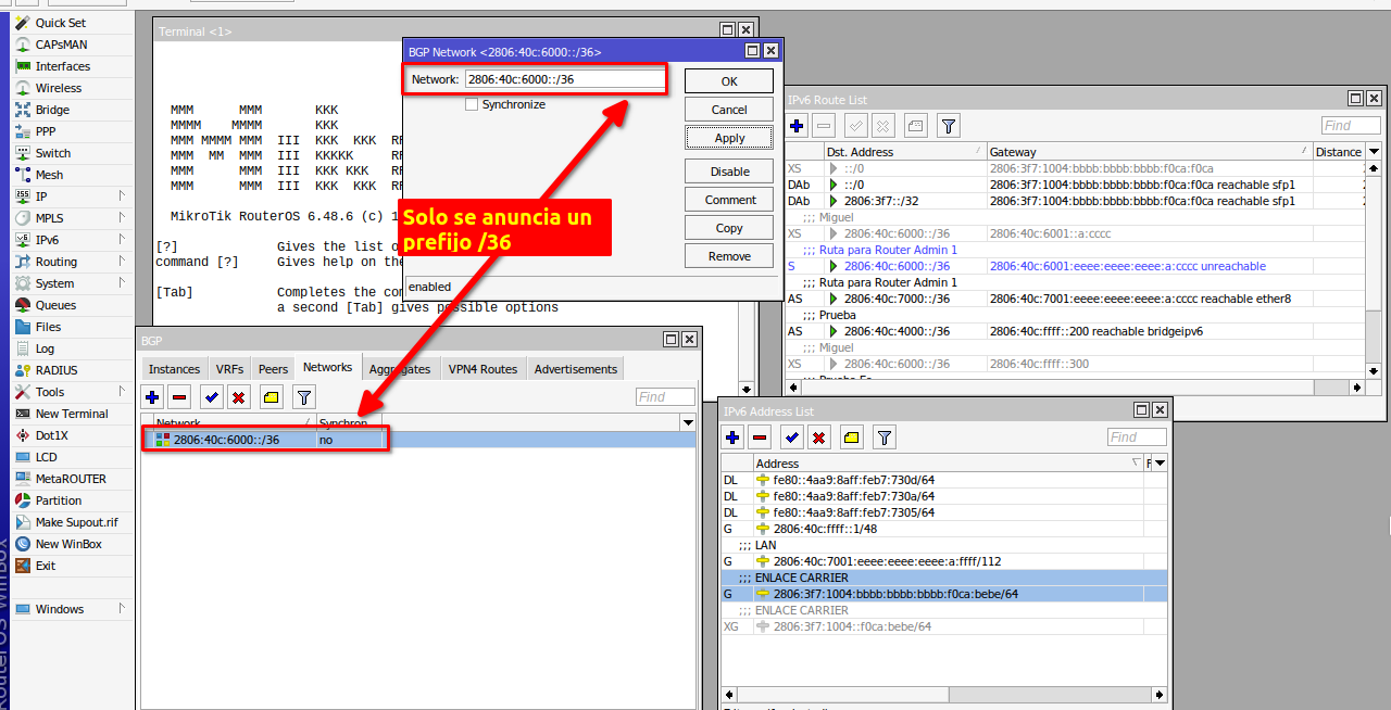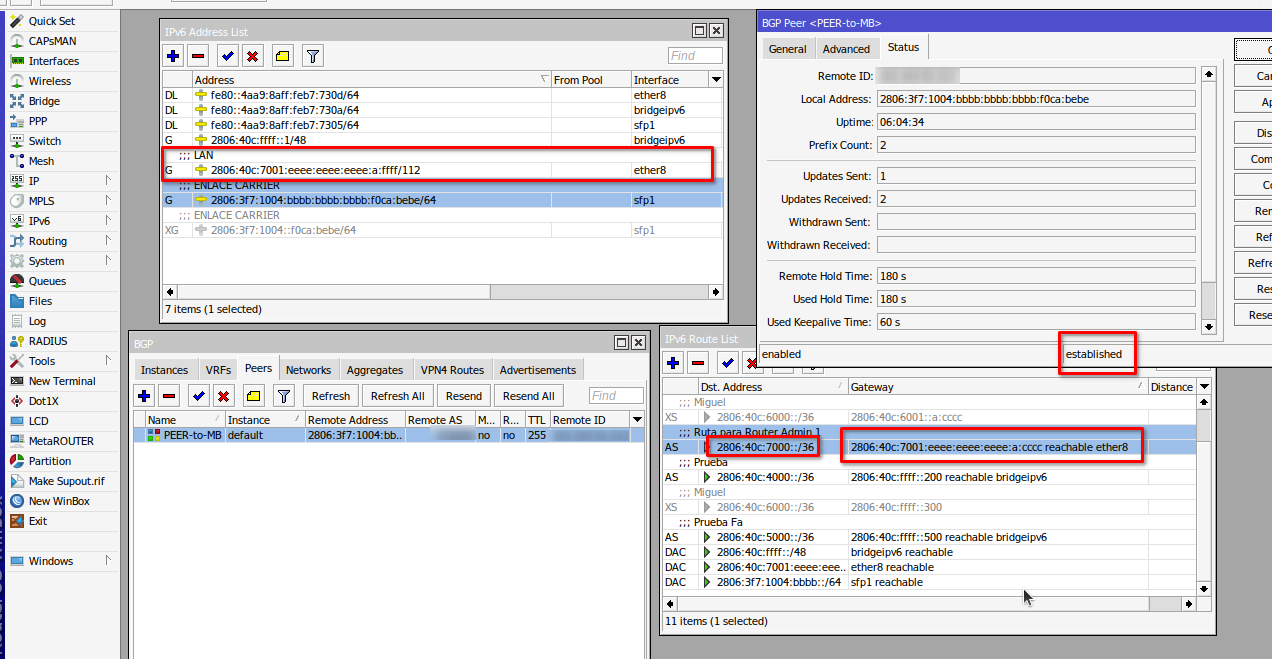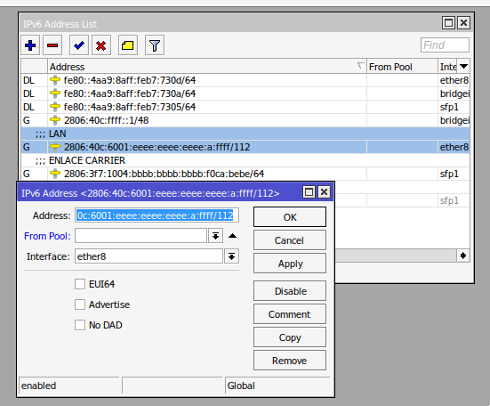 /ipv6 address add address=2806:040c:6001:eeee:eeee:eeee:000a:cccc/112 advertise=no comment=Enlace con BGP - 2