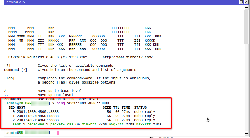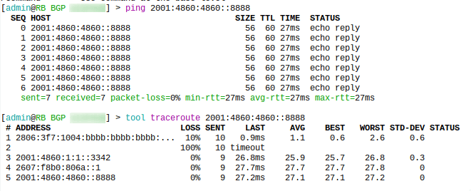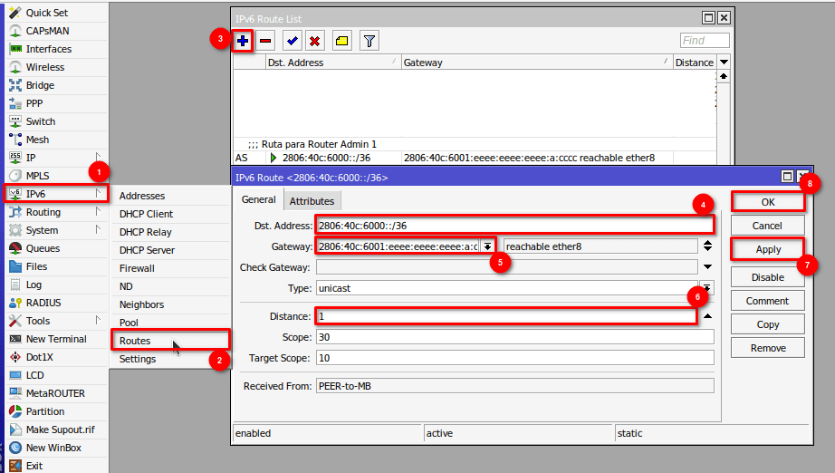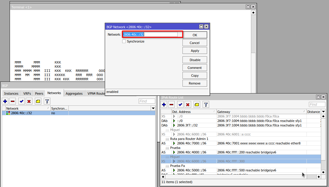 /ipv6 route comment="Ruta estatica hacia el BGP" distance=1 gateway=2806:040c:6001:eeee:eeee:eeee:000a:ffff