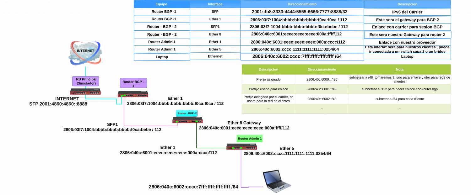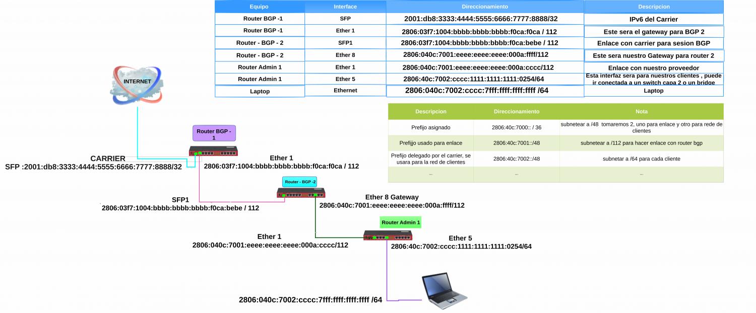 Para este caso usaremos 2 ips de nuestro prefijo seleccionado, que son: 2806:40c:6001:eeee:eeee:eeee:000a:cccc/112 para el Eth1 del Router Admin 1 y 2806:040c:6001:eeee:eeee:eeee:000a:ffff/112 para el Eth 8 del BGP - 2.