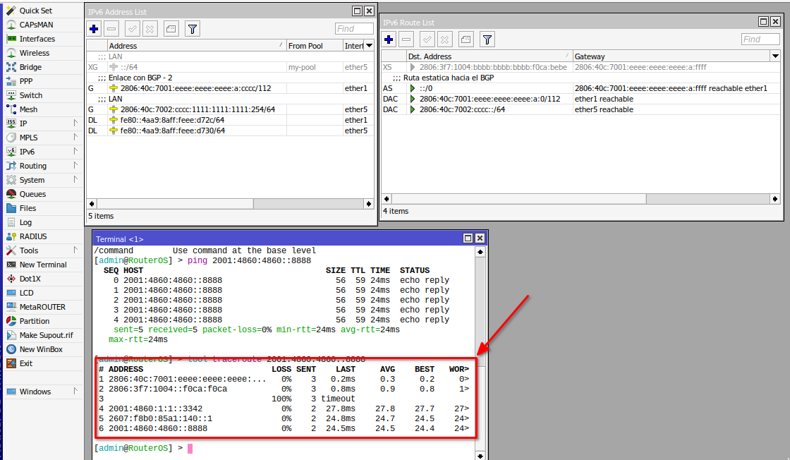 Realmente podemos usar cualquiera de las 18 millones de IPv6 que nos da nuestro 2806:040c:6002:cccc::/64. pero nosotros usamos esta ip 2806:40c:6002:cccc:1111:1111:1111:0254/64 para el ether5, para que sea facil de recordar.