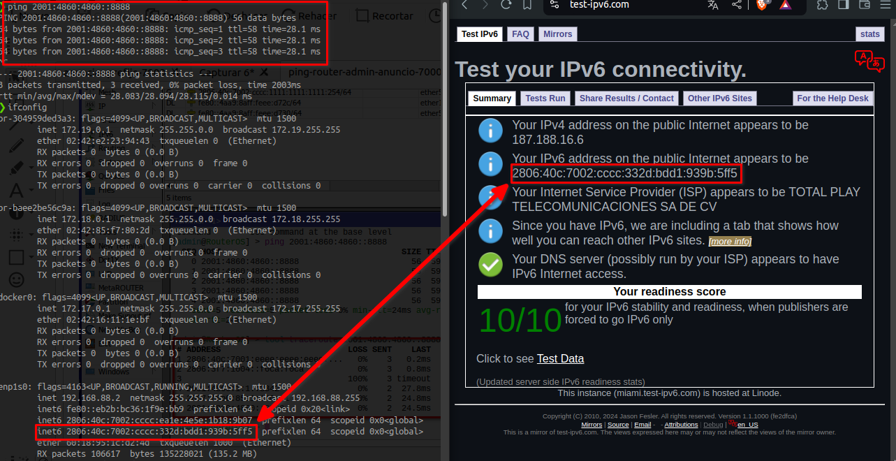 De igual forma podemos abrir un navegador web e ir hacia la siguiente URL https://test-ipv6.com/. En este sitio nos hacen un test que validará que nuestra salida a Internet con IPv6 sea correcta.
