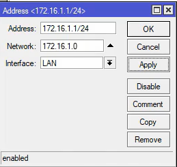 add address=172.16.1.1/24 interface=ether1 network=172.16.1.0
