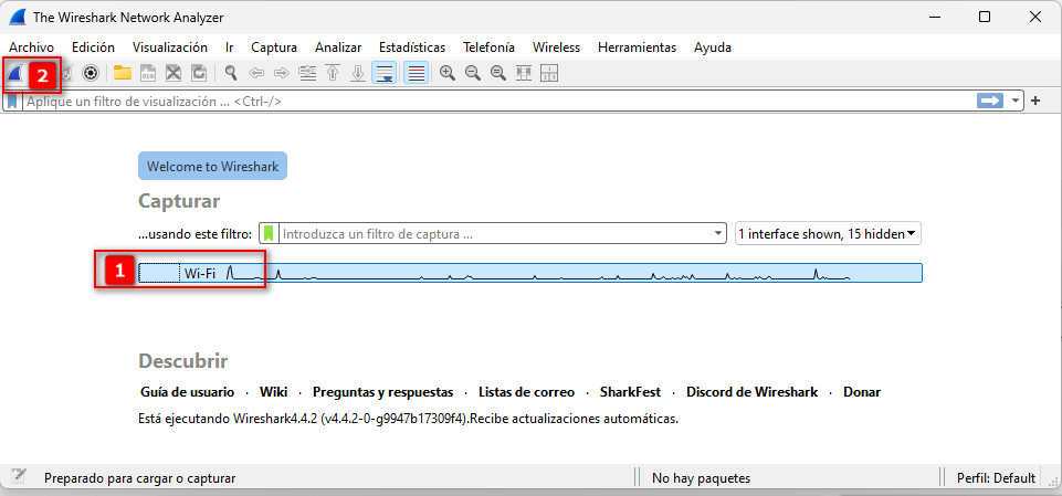 2 Ya que está descargado e instalado vamos a abrirlo y a seleccionar la interface que vamos a capturar.