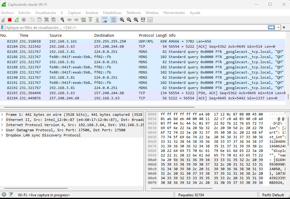 Vamos a ver en Wireshark como aparecen las peticiones y las respuestas a nivel de protocolo y a nivel datagrama.