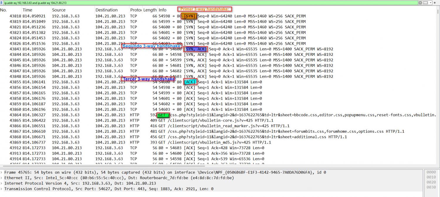 11 Ya aplicado el filtro podremos observar como se realiza un 3-way-handshake (proceso del protocolo TCP para establecer conexión entre un cilente y servidor.)