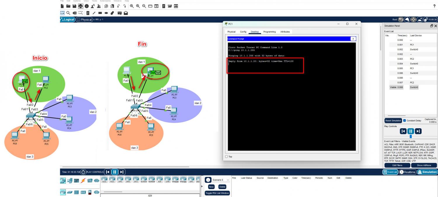 Podemos observar que al no tener una vlan asignada el paquete se envía atreves de todos los pc