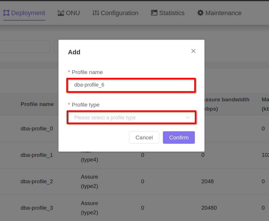 El DBA Profile ( Dynamic Bandwidth Assingment ) especifica o controla el trafico ascendente (upstream desde la ONU). Normalmente todavía necesitamos configurar el upstream y downstream porque el control del perfil DBA solo modifica el upstream de la ONU, lo que significa que no hay limitación en el downstream.