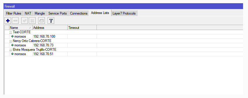 add address=192.168.70.100 comment=Test-CORTE list=morosos
