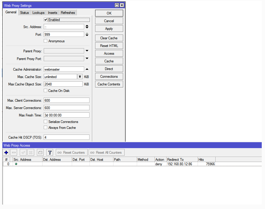 El web proxy es el encargado final de denegar el tráfico y mostrar la página de pagos. La redirección global realmente occure así: Tráfico de IPs de morosos (en el NAT, paso 3) -> Web Proxy (Aquí)-> Página de pagos (en el ejemplo es 192.168.80.12:86, pero puede ser cualquier página o IP).
