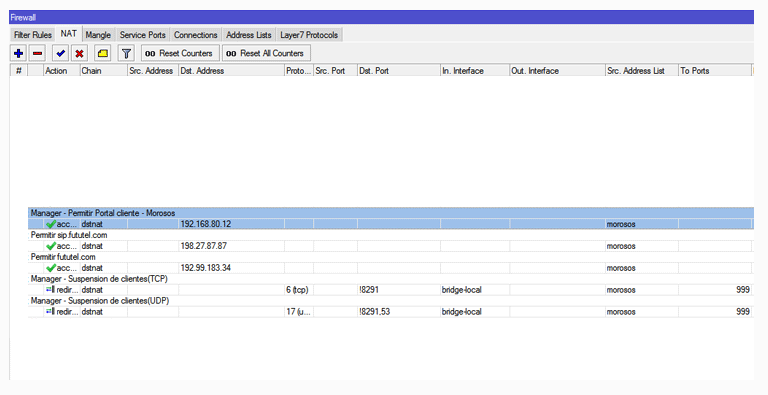 Estas reglas agrupan las IPs fijas de los usuarios o clientes morosos en la lista morosos. Estas IPs probablemente serán las IPs estáticas de los CPEs. Cada vez que quieras cortar el internet de un cliente, deberás agregar su IP a la lista morosos y ya está.