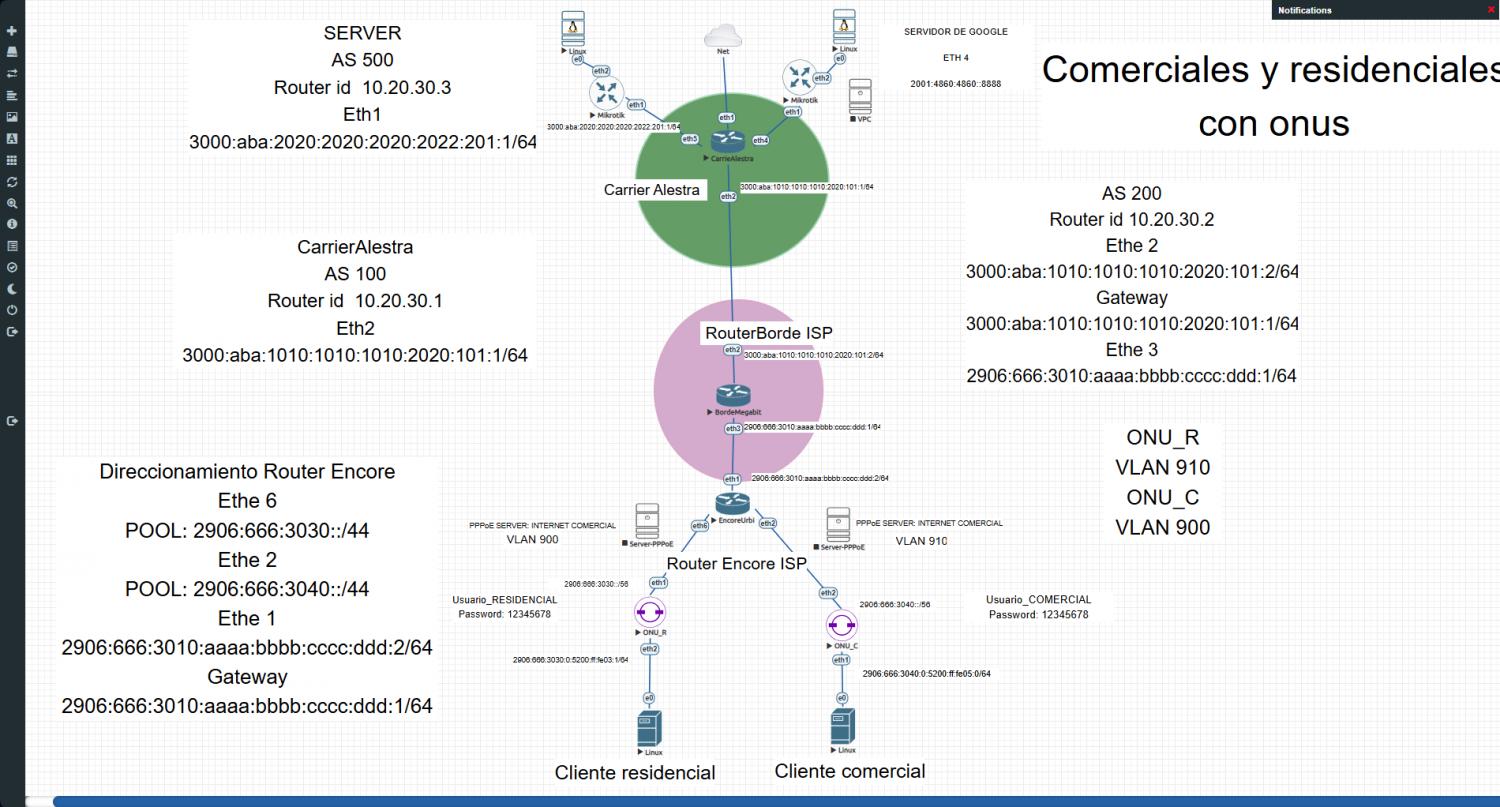 En este laboratorio se simulara BGP con IPV6, pasando ONUS con el protocolo PPPoE a clientes residenciales y clientes comerciales