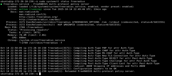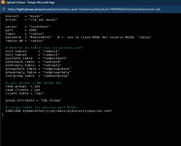 Si ambos muestran active (running), en tu entorno de FreeRADIUS + MySQL en Ubuntu 22.04 LTS (Amazon Lightsail) Esto indica que se instalaron los servicios y que existen
