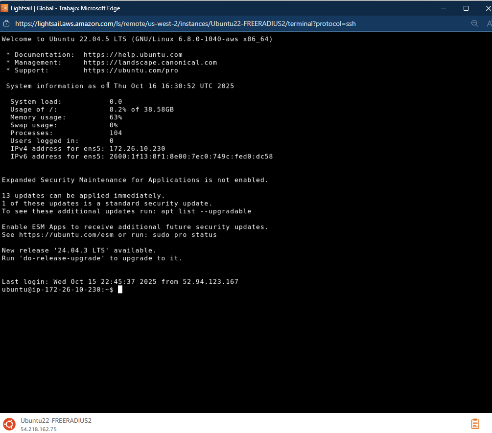 Este manual detallará la instalación y configuración de FreeRadius en un servidor Linux en una instancia de amazon lightsail con una base de datos MySQL para el registro y autenticación de usuarios. Además, explicará cómo establecer la conexión entre un router MikroTik y FreeRadius. FreeRadius se utiliza para gestionar la autenticación y autorización de usuarios en redes, mientras que MySQL actúa como el almacén de datos para usuarios y atributos. La integración con MikroTik permitirá un control centralizado sobre el acceso a la red, proporcionando seguridad y administración eficientes. El manual guiará a través de cada paso, desde la instalación inicial hasta la configuración detallada de FreeRadius y la conexión con los routers MikroTik, permitiendo a los administradores tener un control más preciso y seguro sobre su infraestructura de red.