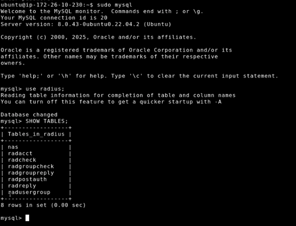 sudo mysql -u radius -p radius < /etc/freeradius/3.0/mods-config/sql/main/mysql/schema.sql