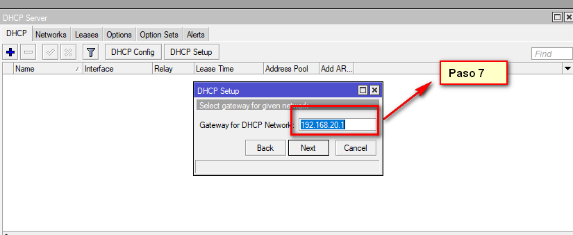 7 Aqui veremos el Gateway de nuestra LAN . el cual servira para poder dar acceso a internet a las ips que generara una vez concluido nuestro DHCP Server