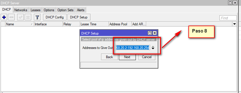 8 En este paso veremos el rango de ips que nos estara entregando el DHCP Server , aqui podemos modificar que numero de ips que vayamos utilizar o simplemente podemos dejar asi no pasa nada , en mi caso utilizare las 252 ips que me esta entregando esta configuracion . Solo recordemos que esta configuracion nos dara ips libres ya que la primer ip la (192.168.20.1 )es del gateway y la ultima la 192.168.20.255 es del brodcast y esas no se pueden utilizar