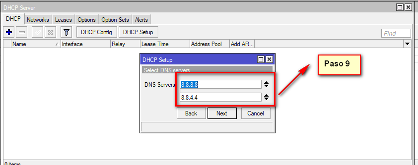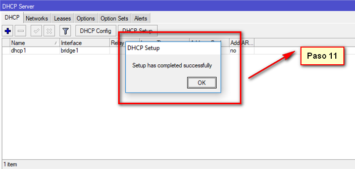 11 En este paso nos debe aparecer un recuadro que dice exitoso en español lo cual nos dice que se creo correctamente nuestro DHCP Server , ni no es el caso vuelve a intentar hasta que aperezca este aviso de exito en tu configuracion .
