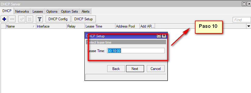 10 En esta opcion podemos definir el tiempo que va a tener la ip que entregue el RB a los dispositivos , ya puede ser minutos , horas o dias . ya que una ves concluido el tiempo que hayamos determinado , se nos asignara otra ip del mismo rango .