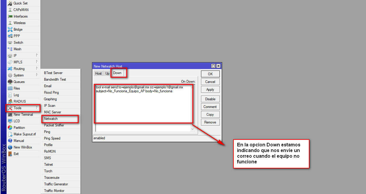 En la opción Up vamos a ingresar los correos, esta función nos sirve para que nos llegue la notificación cuando el equipo esté funcionando correctamente les dejo un script para que lo modifiquen a su manera