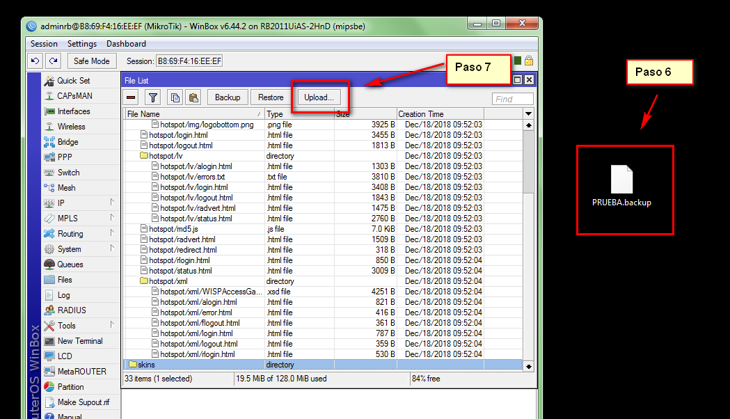 7 En este paso ya es cuando se desea restaurar el respaldo en el mismo RB o en otro nuevo , solo damos click en la opción Upload y aparecerá una nueva ventana en la cual subiremos nuestro respaldo de la carpeta o lugar donde tengamos nuestro documento de texto en mi caso yo lo tengo en el escritorio
