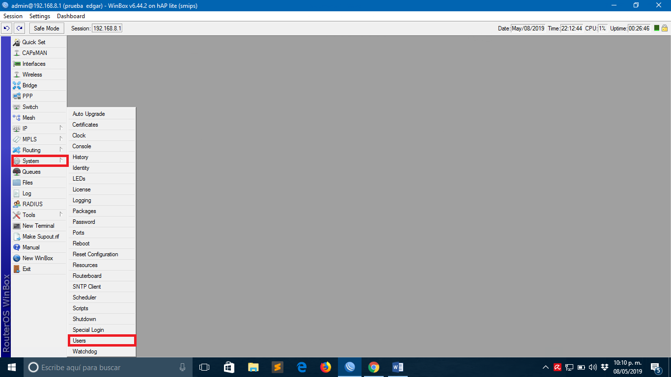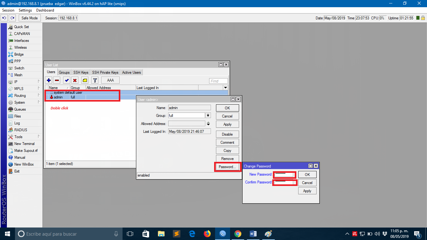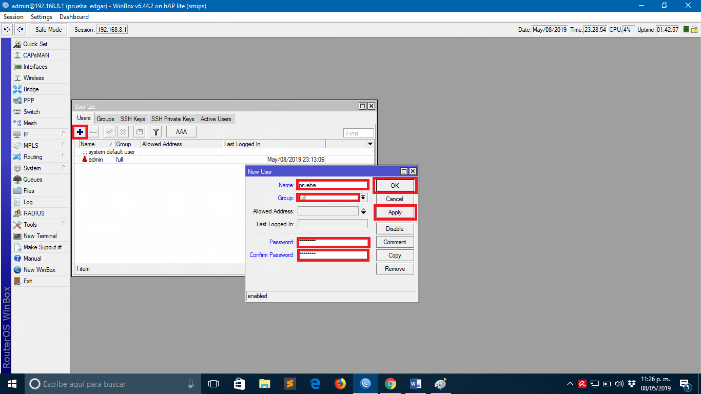 . Yahora ya podremos acceder a nuestro equipo Mikrotik mediante admin y la nueva contraseña o mediante el usuario que acabamos de crear.