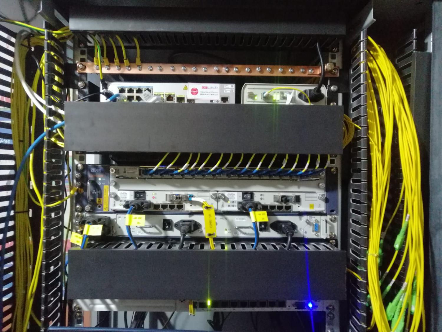 Le enseño esta OLT ZTE C320, cuenta con una tarjeta de servicio de 16 PON y dos tarjetas de gestión. La tarjeta de alimentación es DC, así que esta conectada a un alternador de corriente.