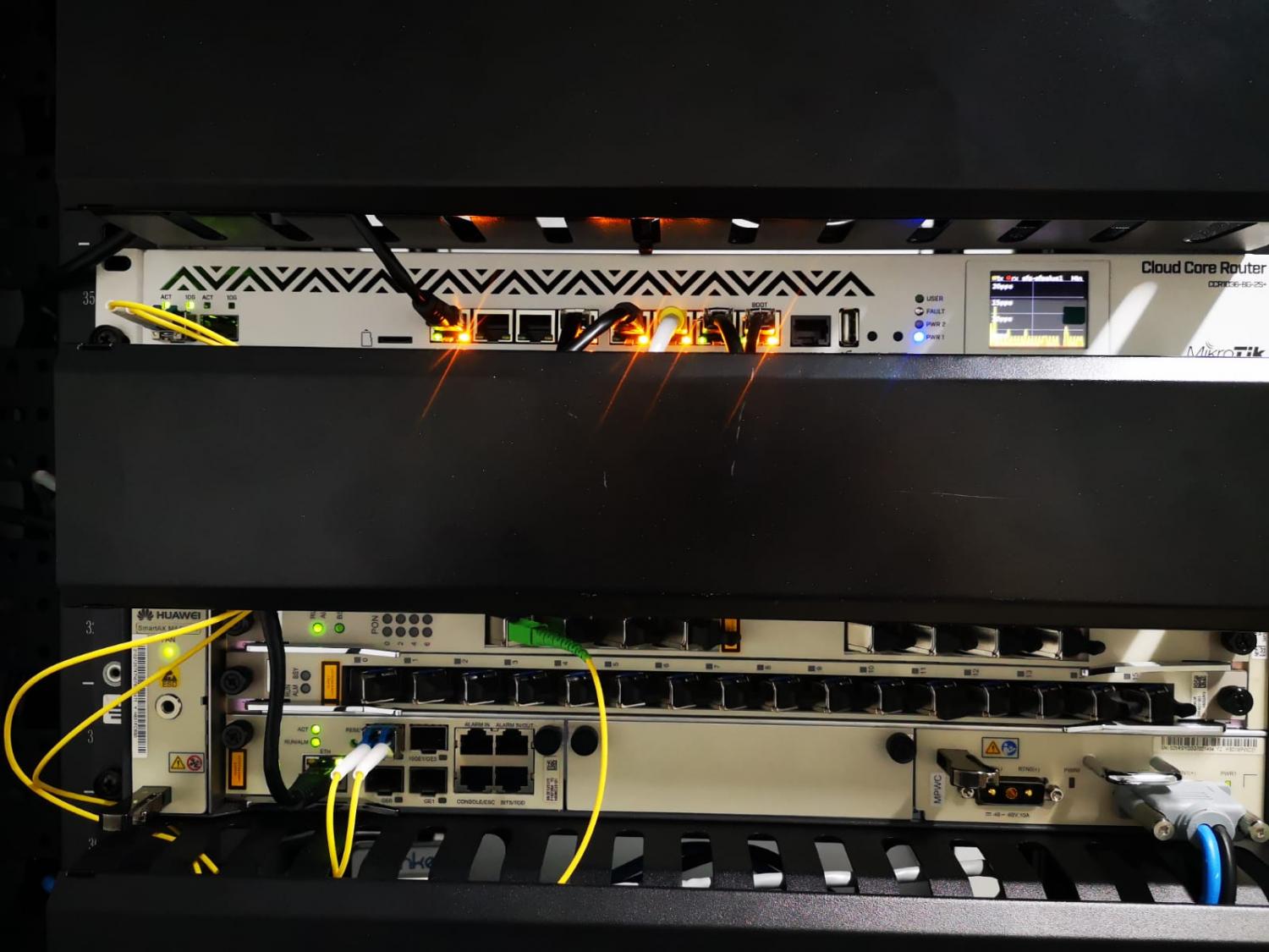Les comparto este OLT Huawei MA5608T, tiene dos tarjetas de servicio. una de 16 puertos PON y otra de 8 puertos. La tarjeta de gestión cuenta con 4 puertos Uplink, dos de 1G y dos de 10G. La conexión va hacia un Mikrotik CCR, en donde el puerto SFP ha sido configurada para que negocie a 10G.