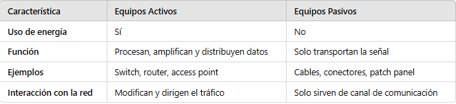 Los equipos activos requieren energía eléctrica para funcionar y son responsables de transmitir, amplificar o dirigir los datos en la red.