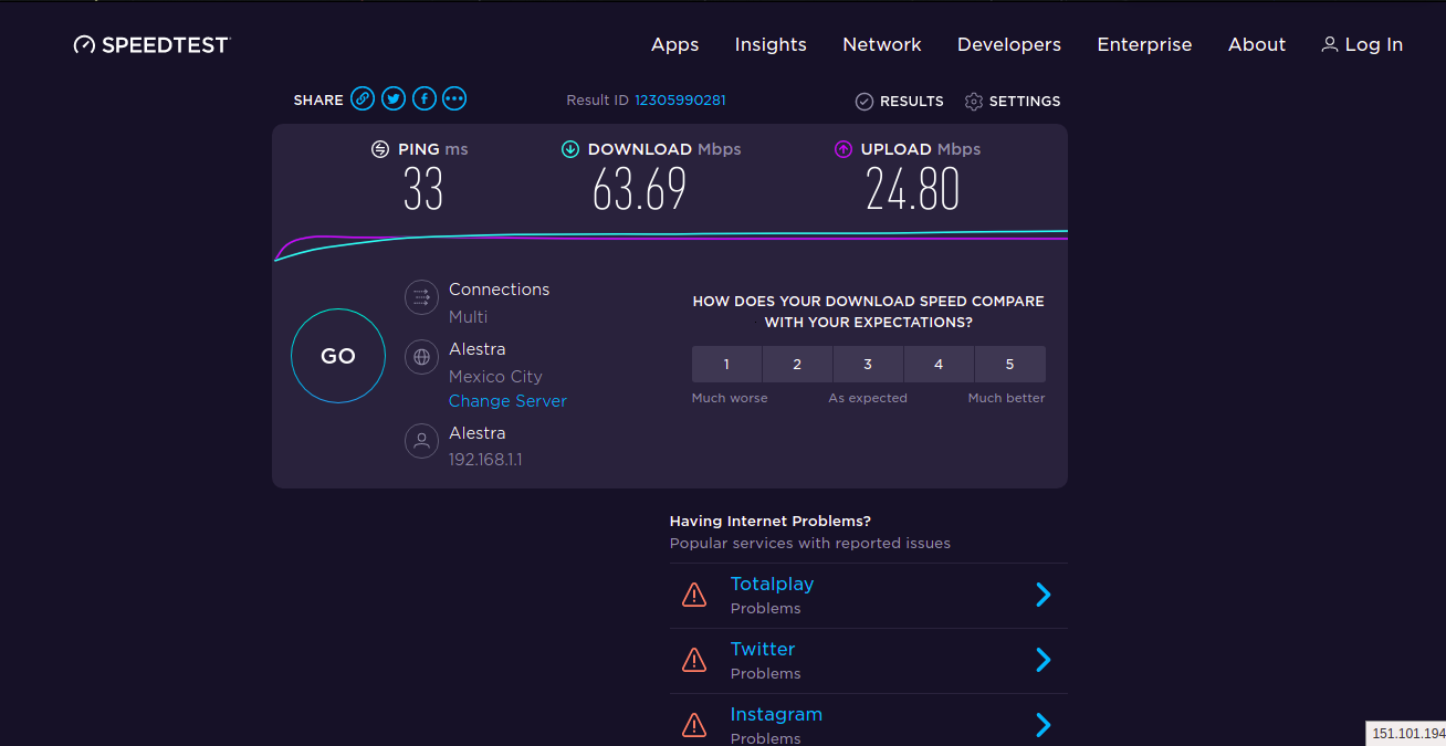 Ahora debemos comprobar que tengamos internet conectandonos a la ONU por cable o por wifi, y aplicando un speedtest.