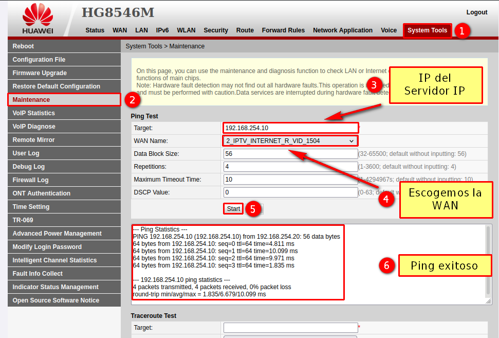 Paso 2: Comprobar que la ONU tenga conexion con nuestro servidor IPTVAntes que conectemos nuestro equipo a la ONU, es importante que este tenga conexion con nuestro servidor IPTV, como se muestra en el diagrama del primer comentario nuestro servidor tiene la IP 192.168.254.10, por lo cual vamos a dar ping desde la ONU a esa IP y ver que podamos alcanzarla.