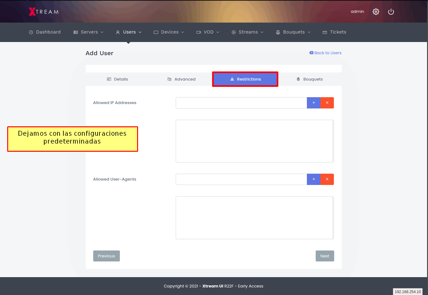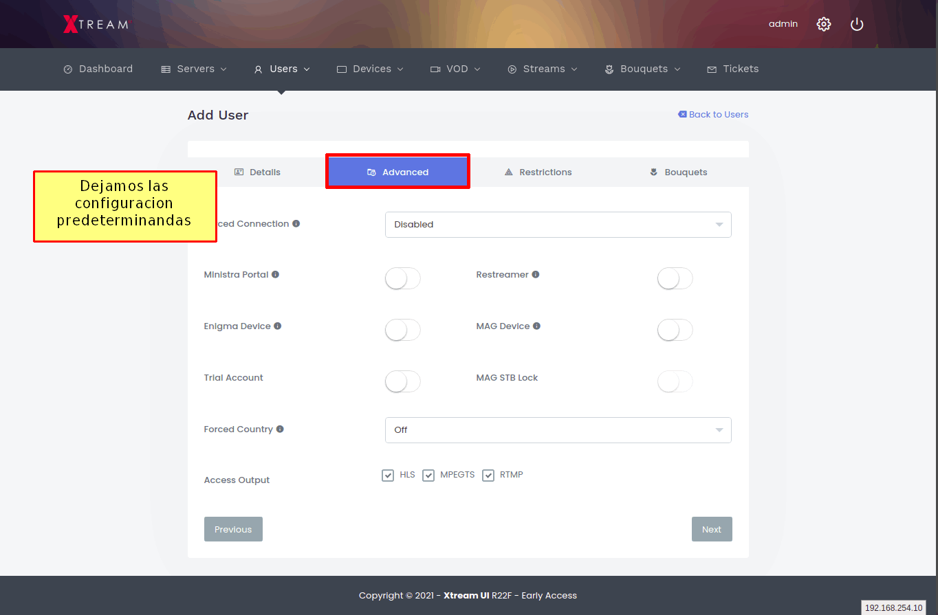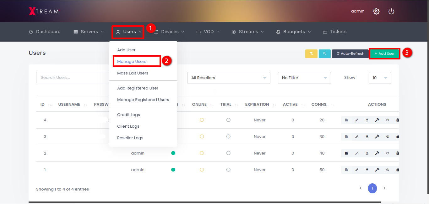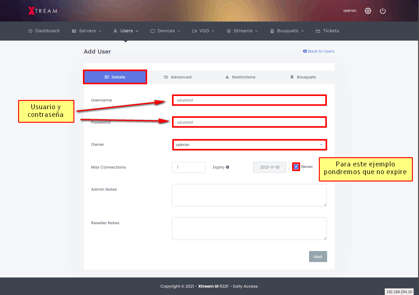 Debemos entrar la interfaz del servidor, nuestro ejemplo es un servidor Xtream UI. Crearemos un usuario para poder conectarnos al servidor. Puede guiarse de las siguientes imagenes.